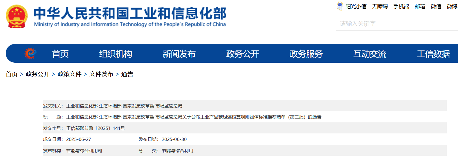 工業(yè)和信息化部等四部門關于公布工業(yè)產品碳足跡核算規(guī)則團體標準推薦清單(第二批)的通告